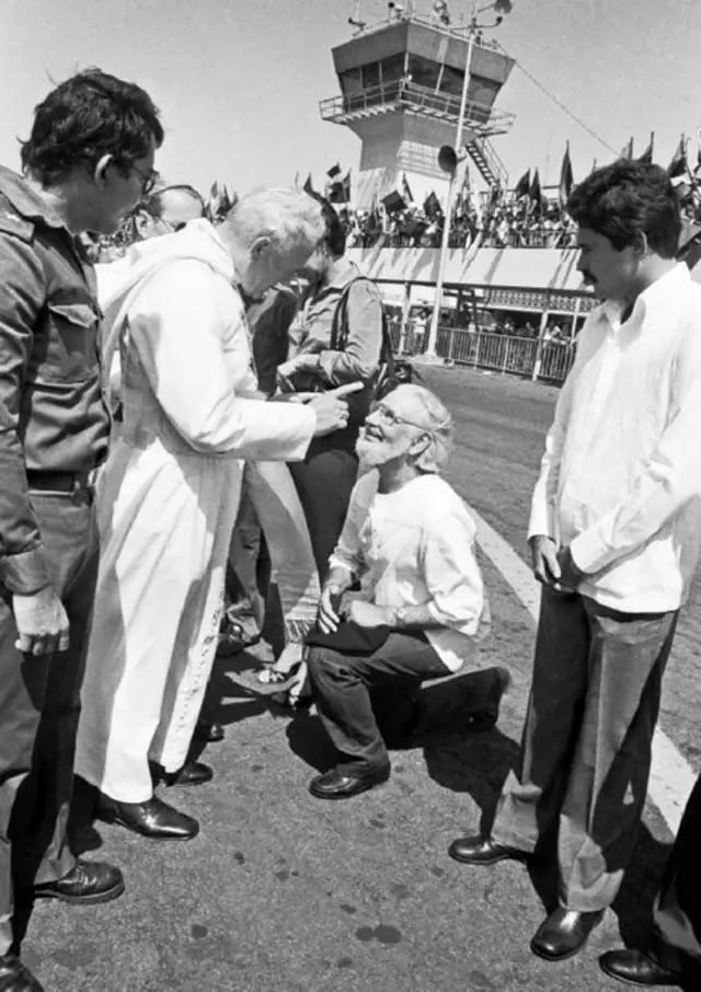 El 4 de marzo de 1983 Cardenal acudió al aeropuerto de Managua para recibir al pontífice Juan Pablo II en su primera visita a Nicaragua. El papa, con gesto adusto y un dedo acusador, lo amonesta públicamente frente a sus colegas del gobierno de Nicaragua que le acompañaban. «Usted debe regularizar su situación», fue la amonestación pública de Juan Pablo II. «Como no contesté nada, volvió a repetir la brusca admonición. Mientras, enfocaban todas las cámaras del mundo», contaría posteriormente en su autobiografía el poeta y sacerdote. La escena fue la manifestación mas clara del conflicto entre Cardenal y la jerarquía católica por causa de su compromiso con la Revolución Sandinista(1979-1990).
