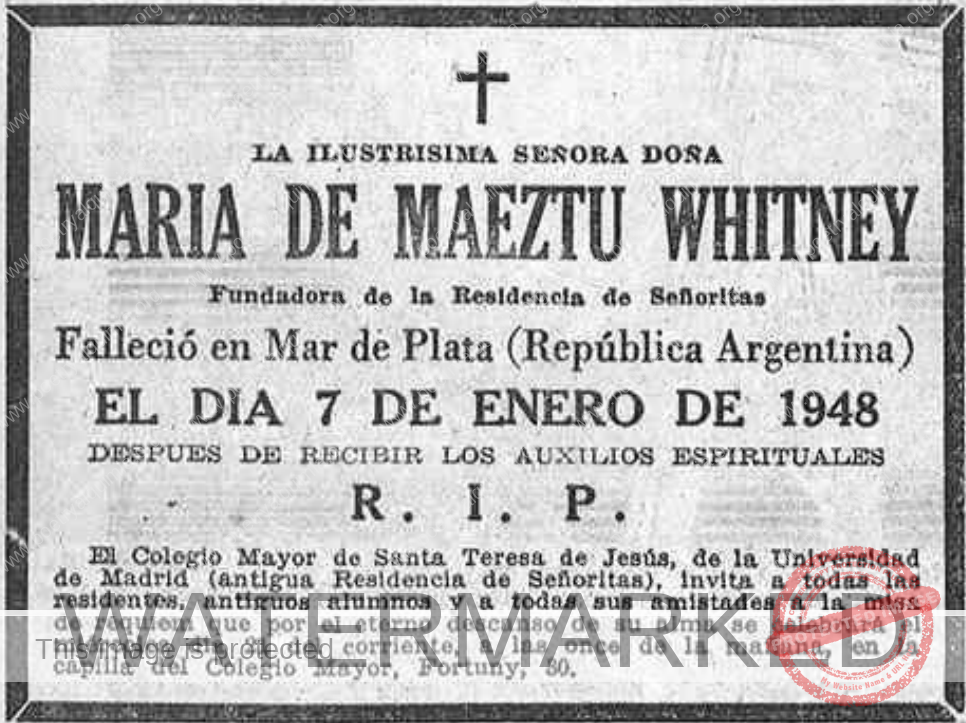 Al año siguiente, sin que su sueño de venir a residir de manera definitiva a España se llegara a cumplir, Maria de Maeztu muere el 7 de enero de 1948, casi repentinamente, en un balneario de Mar de Plata.